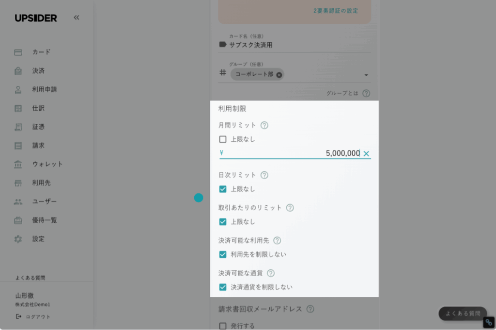 例えば、海外出張が多い役員や営業部長にだけサブカードを持たせ、渡航関連の決済はそのカードで行うようルール化します。これにより、全社的な経費管理の効率性はUPSIDERで担保しつつ、必要な従業員への福利厚生や安全も確保できます。