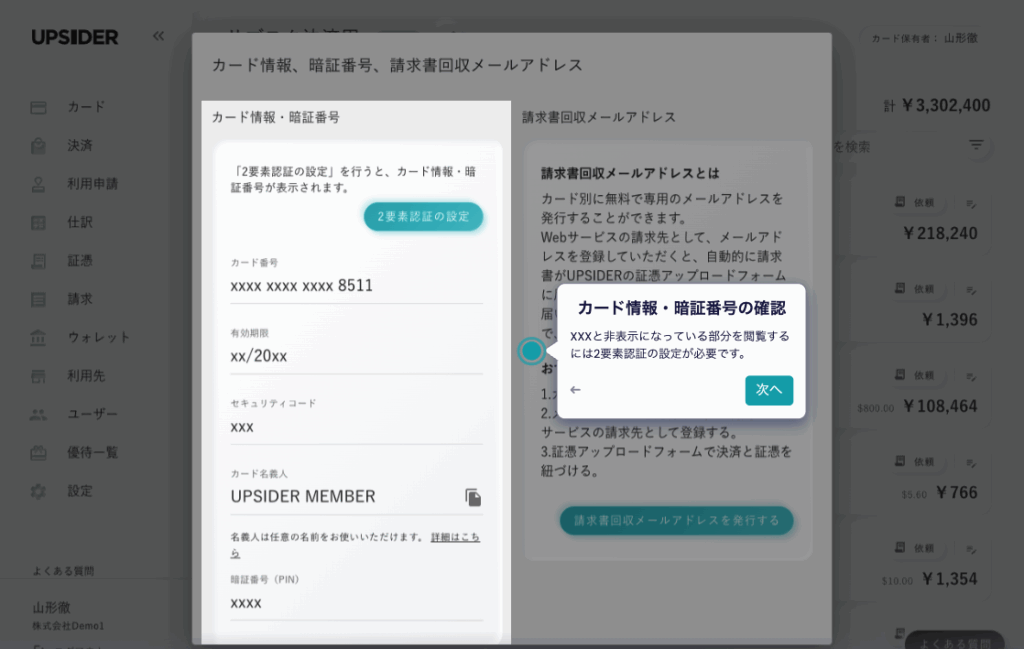 経費管理機能 | ◎ (UPSIDERの先進的機能が利用可能) | △ (カード会社の標準的なWeb明細機能) |