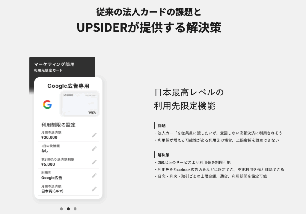 UPSIDERのバーチャルカード機能を使えば、この問題を解決できます。SaaSや広告アカウント一つひとつに対して専用のバーチャルカードを発行し、利用上限額や利用先を設定することが可能です。これにより、支払い元が明確になり、予期せぬ高額請求や不正利用を防ぎます。