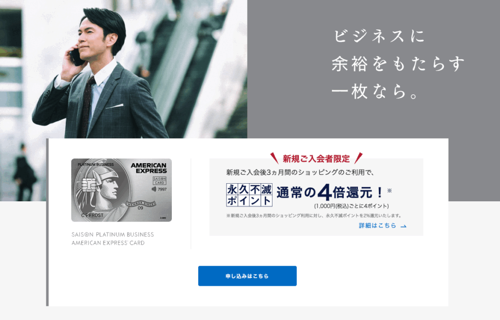 例えば「セゾンコバルト・ビジネス・アメリカン・エキスプレス・カード」は、AWSや特定のクラウドサービス、ビジネス向け通販サイトなどでポイント還元率が最大2.0%(通常の4倍)になる特典があります。